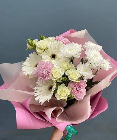 По мнению нашего флориста, это букет представляет собой истинное произведение искусства, сочетающее в себе нежность и головокружительность. В его состав входят 3 белых герберы, символизирующие чистоту и нежность чувств, 3 розовые гвоздики, которые добавляют нотку страсти и романтики, 2 белых кустовых розы, придающие букету изысканность и элегантность, а также 1 кустовая белая хризантема, символизирующая восторг и радость. Этот потрясающий букет словно олицетворяет первую любовь – нежный, трепетный и запоминающийся на всю жизнь. Нежные цвета цветов передадут самые неистовые чувства и эмоции, заставляя сердце биться быстрее. Упаковка в тон букета идеально завершает композицию, подчеркивая его изысканность и элегантность. Подарите этот букет своей возлюбленной или возлюбленному, чтобы выразить свою любовь и восхищение. Он станет прекрасным символом страсти и элегантности, запечатляющим нежные моменты ваших отношений.